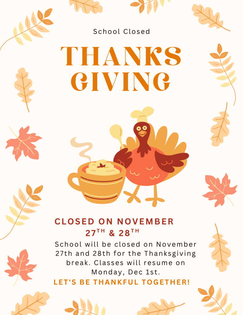 Dear Parents and Families,We hope you all enjoy a warm and joyful Thanksgiving surrounded by loved ones. As we take this time to give thanks and reflect on gratitude, we want to remind you that school will be closed on November 27th and 28th for the Thanksgiving break. Please note that after-school care will be […]